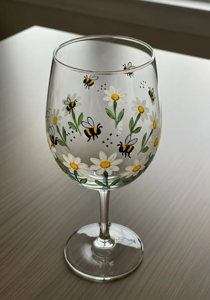 This charming design features small white daisies scattered around the glass with tiny yellow centers and delicate green stems. Little painted bees buzz between the flowers which adds a playful garden theme. The overall look feels light and sweet like a peaceful meadow on a sunny day.