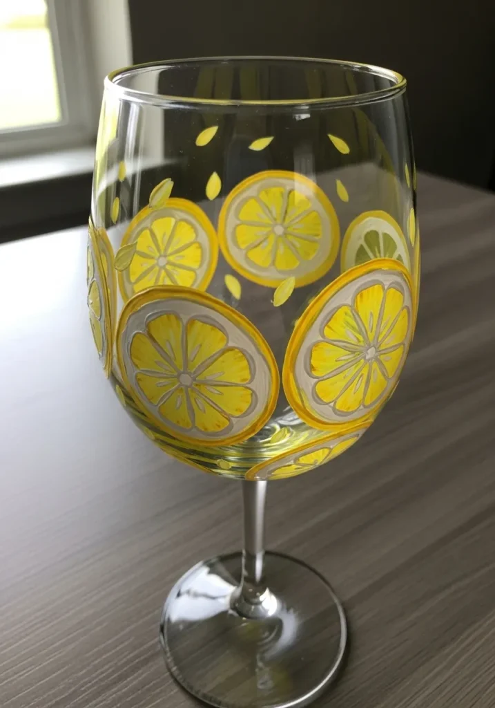 I always think fruit themed crafts bring instant happiness to a project. Lemon slices are simple circles so they are very beginner friendly to paint. The bright color also hides little imperfections which makes the process feel relaxed and forgiving. This is the kind of glass I would love to use for a summer drink or display on an open kitchen shelf.