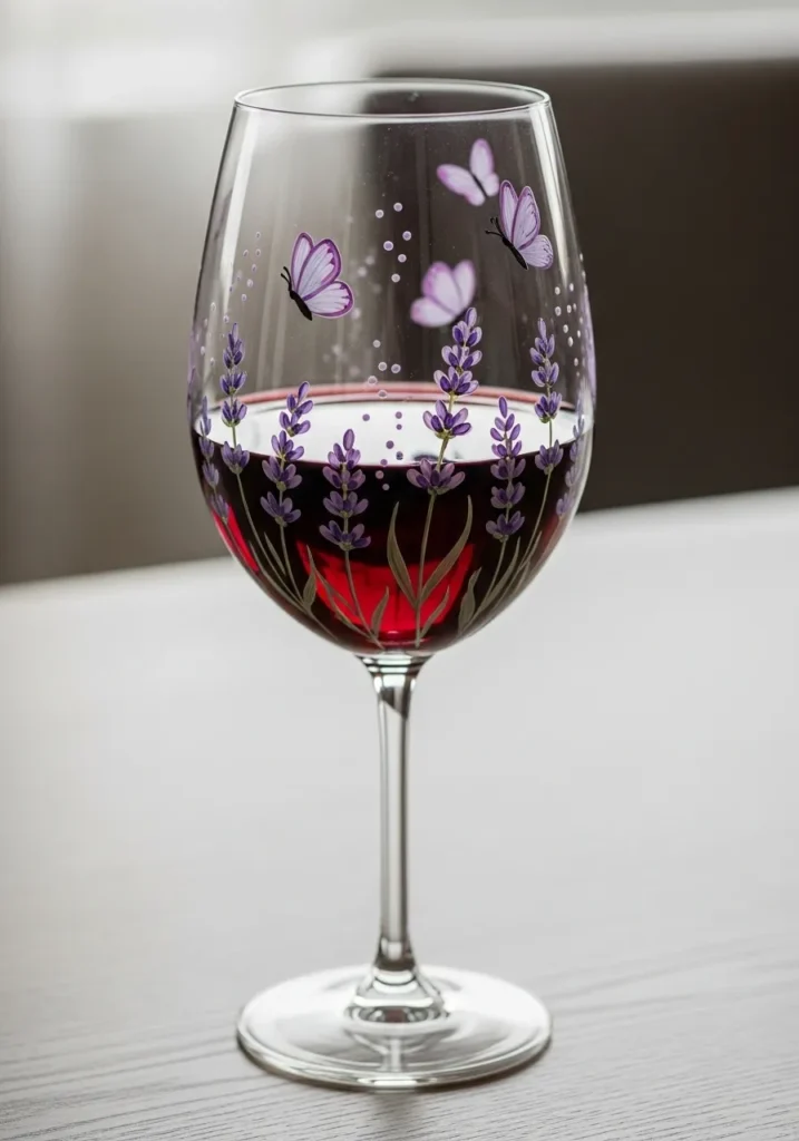 This delicate wine glass features tiny lavender butterflies fluttering across the upper half of the glass. The butterflies are painted in soft purple tones with light outlines that make their wings feel airy and graceful. When red wine fills the glass the butterflies appear to float above the deep color which creates a really pretty layered effect. The design feels light and elegant without covering too much of the glass.