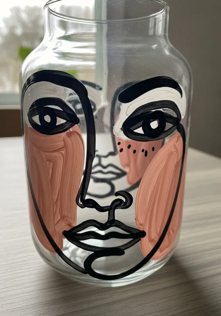 This clear glass jar transforms into a gallery-worthy piece with just a few bold strokes of black and terracotta paint. The design features a minimalist hand-painted face using fluid line art that wraps around the curved surface. You can see visible brushy textures in the warm peachy highlights on the cheeks and the crisp white accents near the eyes. The smooth glass background allows the light to hit those painted details perfectly, making the facial features pop against whatever flowers you decide to tuck inside.