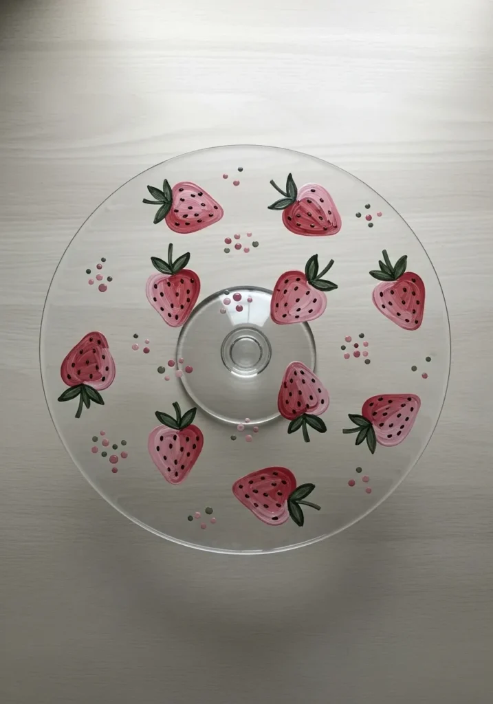 This clear glass cake stand features a delightful berry motif that circles the entire top surface. Each strawberry is hand-painted with a soft pink base and deeper rose colored shading to create a rounded 3D effect. The tiny seeds are meticulously dotted in black while the leafy tops are finished in a muted forest green. Between the larger berries, you can find clusters of tiny pink and grey dots, which add a lovely delicate texture to the overall design. The paint is applied with a smooth, glossy finish that looks beautiful against the polished glass, making every treat you serve look even more appetizing.