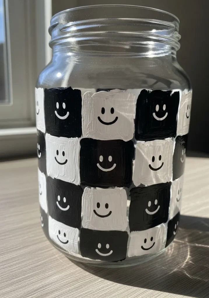 This wide-mouth glass jar features a trendy checkerboard pattern that wraps around its middle in bold black and white. Each square is hand painted with a thick, heavy texture that shows off every individual brushstroke, giving the pattern a cozy, artisanal feel. To add a splash of whimsy, every single square contains a tiny, minimalist smiley face in a contrasting color. The clear glass peeking through at the top and bottom keeps the design feeling light and modern, while the glossy finish on the paint makes the grid pop against the smooth surface.