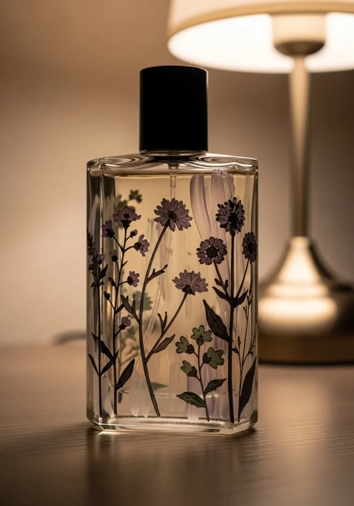 This rectangular glass perfume bottle is reimagined as a dainty botanical garden with delicate purple wildflowers that look almost like real pressed petals. The design features slender dark stems reaching upward with layered lavender and plum blossoms painted in a soft matte finish. Wispy white and lilac brushstrokes in the background create a dreamy, hazy texture that mimics the look of parchment or frosted glass. The dark green leaves are applied with very fine lines, which adds a sophisticated level of detail to the clear glass container, while the sleek black cap keeps the overall aesthetic feeling very modern and luxe.