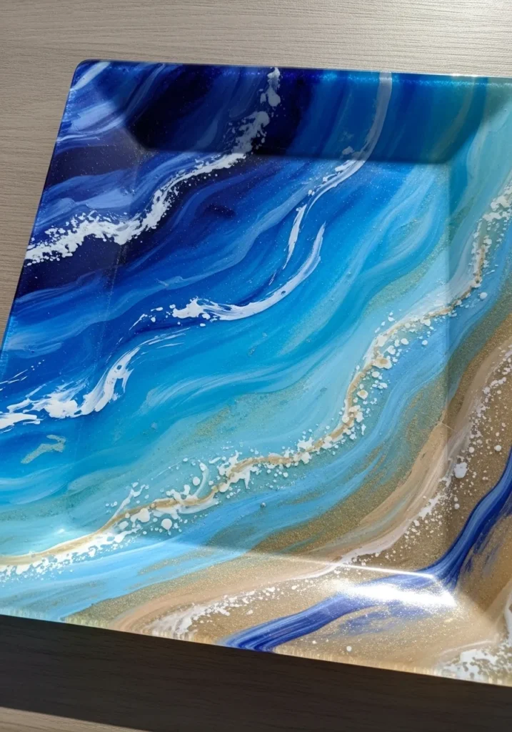 This square glass tray captures the breathtaking energy of the coastline with fluid waves of deep navy, sapphire, and bright cerulean blue. The design features marbled streaks of paint that flow seamlessly into one another, mimicking the natural movement of a tide coming in. A shimmering sandy shore is created using warm gold and tan pigments at the corner, separated from the water by frothy white splatters that look just like sea foam. The glossy finish of the paint, combined with the smooth glass surface, gives the entire piece a liquid appearance that makes the colors look vibrant.