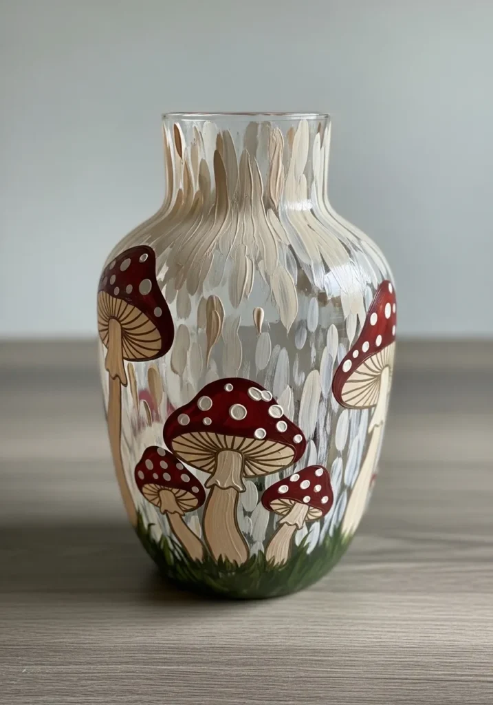 This charming glass vase features a whimsical cluster of hand-painted toadstools that look like they stepped right out of a fairytale. The mushrooms are designed with deep crimson caps and bright white spots, sitting atop sturdy beige stems with intricate gill details underneath. Surrounding the base of the fungi is a lush layer of forest green grass, while the background of the clear glass is filled with vertical strokes of creamy white and tan paint. These textured, raindrop-like markings give the whole piece a magical, misty atmosphere that makes the vibrant red mushrooms truly stand out.
