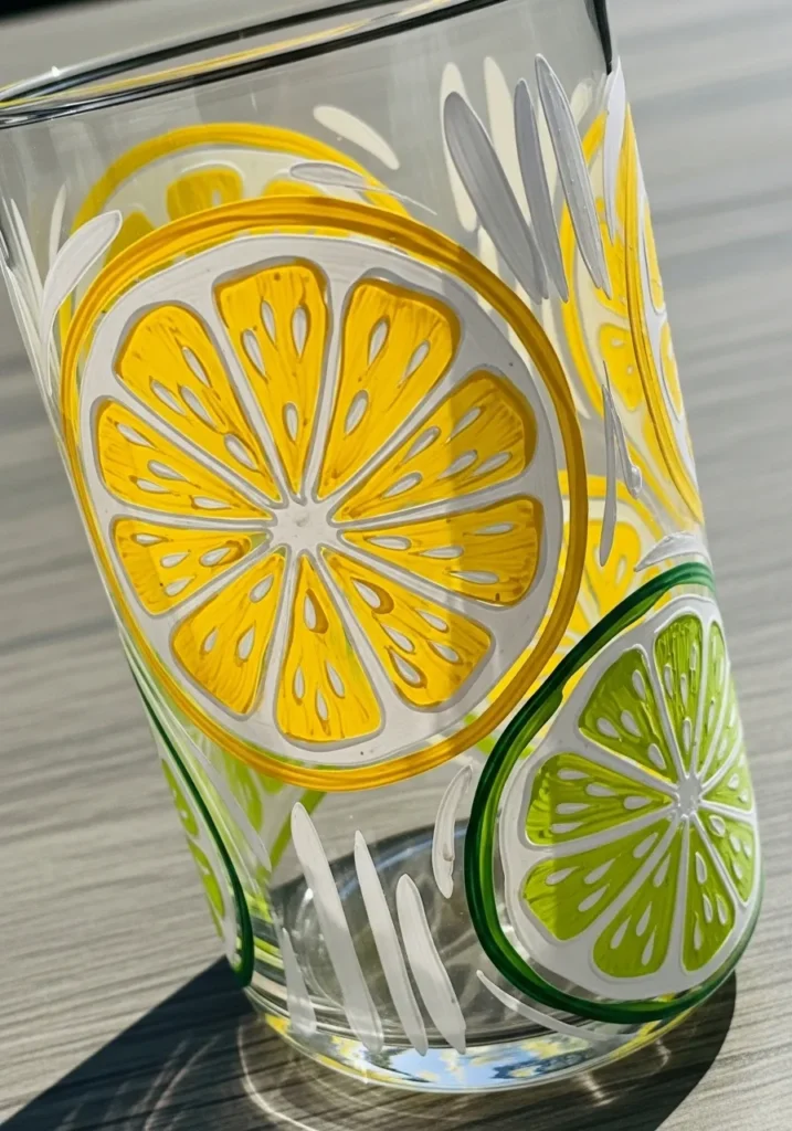 These vibrant glasses bring a burst of sunshine to your kitchen cabinet with their juicy lemon and lime motifs. The design uses thick layers of zesty yellow and bright green glass paint to create realistic fruit segments complete with tiny white seeds and pith details. Crisp white brushstrokes dance around the citrus rounds to add movement and a touch of artistic flair to the clear surface. You can actually see the textured ridges of the paint, which gives the glassware a wonderful tactile quality that feels substantial and high-quality in your hand.