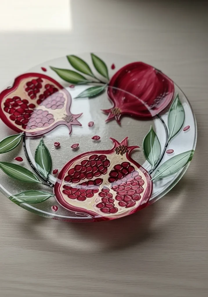 This glass plate features a stunning botanical design that highlights the rich jewel tones of sliced pomegranates. The artwork showcases deep ruby red fruit skins with intricate interior details, including clusters of individual seeds painted in varying shades of garnet and soft pink. Bright spring green leaves with crisp white veining provide a beautiful organic contrast, while the background of the glass is finished with a subtle frosted texture that makes the glossy painted elements truly shine. Small red seed splatters are scattered across the clear sections of the plate, which adds a lovely sense of movement and natural charm to the entire composition.