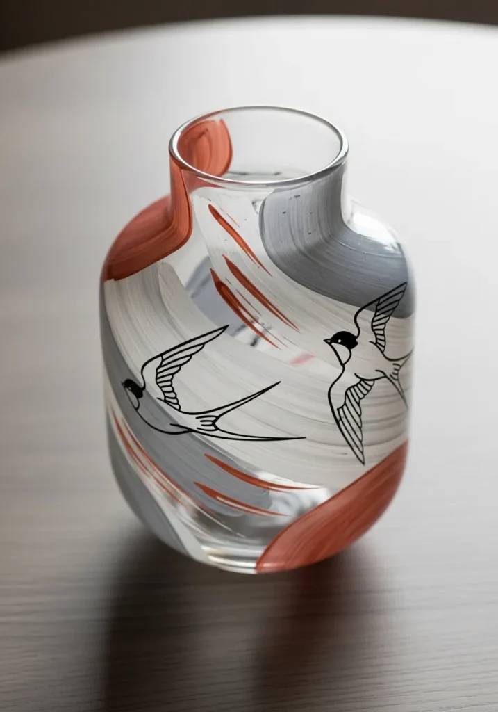 This petite, rounded glass vase features a dynamic scene of swallows in mid-flight, set against a backdrop of broad, sweeping brushstrokes. The birds are rendered in crisp black ink with fine-line detailing on their wings and forked tails, creating a sharp silhouette against the more abstract elements. Thick streaks of white, cool grey, and warm terracotta paint wrap around the curves of the glass, giving a sense of wind and movement. These painterly blocks of color are applied with visible texture, leaving some areas of the glass clear to maintain a modern, airy feel.