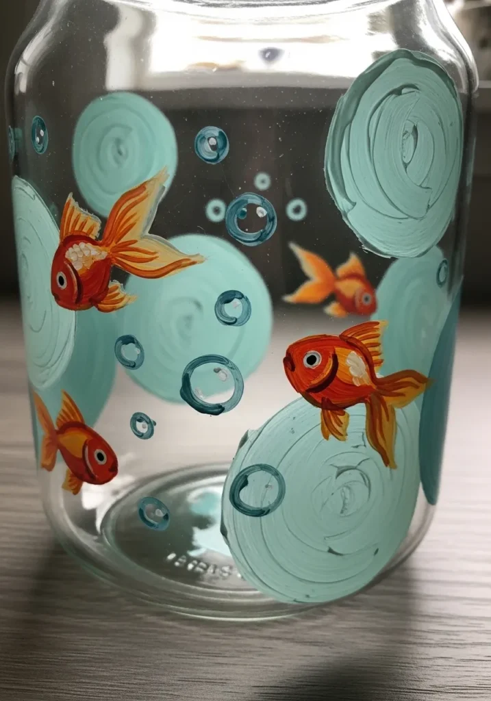 I am absolutely charmed by how this design uses thick, expressive paint to make a simple glass container feel like a piece of custom art. If you’re looking for a project that prioritizes “vibe” over perfect realism, this is the one for you—the swirling circles are incredibly fun to paint and don’t require any precise lines. It feels like a joyful, modern take on a classic aquarium theme, and the way the orange fish pop against those cool minty bubbles is just stunning. This would be a fantastic way to store craft supplies or bathroom essentials while adding a playful, handcrafted splash of color to your shelving.