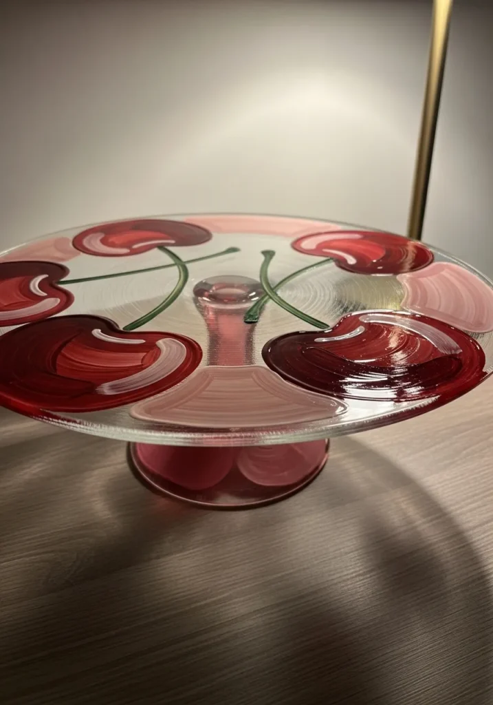 This low-profile glass cake stand features a bold and fruity design that circles the entire plate. Large, stylized cherries are hand-painted in a rich spectrum of deep burgundy, vibrant red, and soft blush pink. Each cherry is composed of thick, swirling brushstrokes that give the fruit a juicy, three-dimensional appearance. Long, elegant stems in a muted forest green connect the pairs of cherries, arching gracefully toward the center of the stand. The paint is applied with a heavy, impasto-like texture that creates a tactile contrast against the smooth, clear glass of the pedestal and plate.