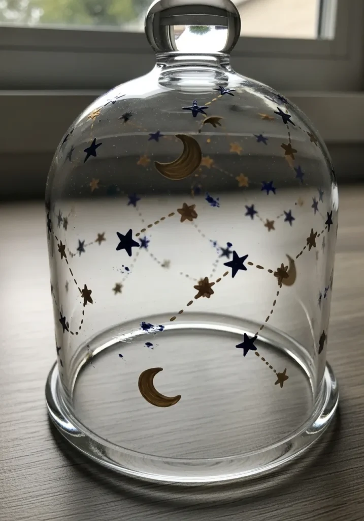 This project is the perfect way to wrap up your glass painting journey because it combines simple shapes—dots, lines, and crescents—into something that looks incredibly intricate and sophisticated. If you’re a fan of dark academia or celestial home decor, this cloche is a must-have for displaying your favorite crystals, candles, or dried botanicals. It feels so peaceful to create your own little universe, and because constellations are naturally unique, there is no “wrong” way to place your stars. It’s a stellar ending to a beautiful DIY series!
