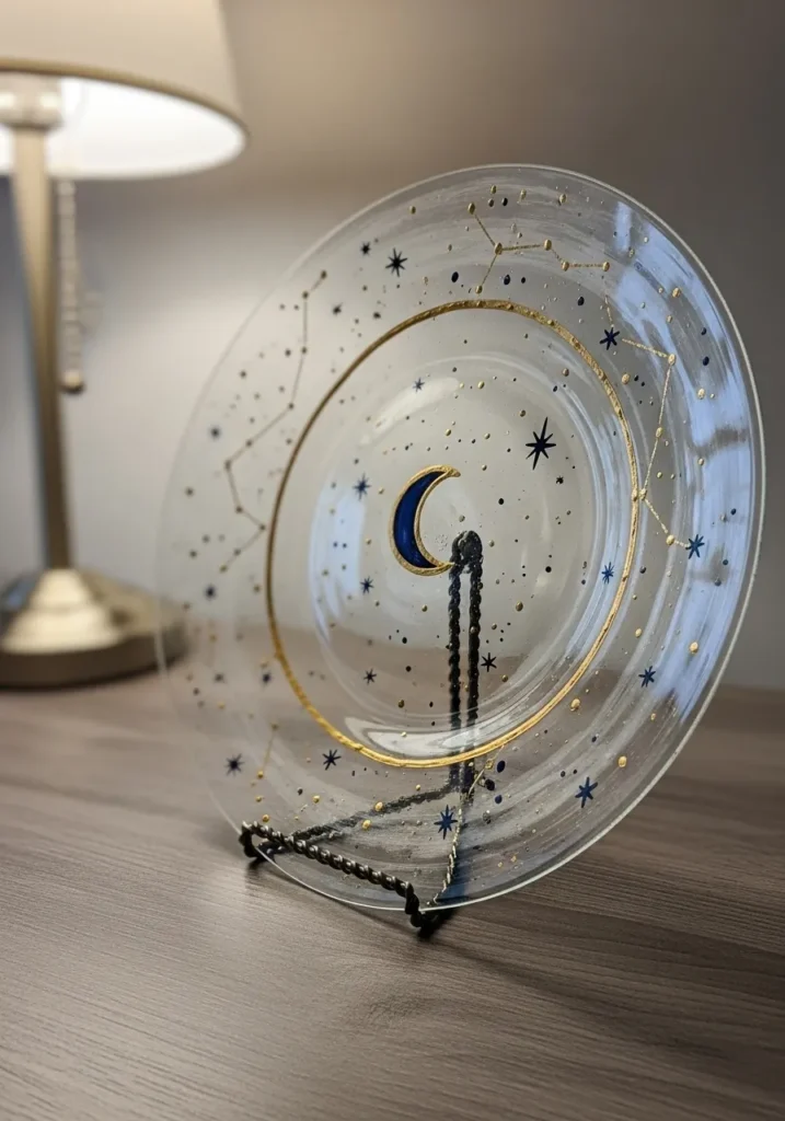 This ethereal glass plate captures the magic of a clear night sky using delicate gold and deep navy blue pigments. At the center sits a shimmering crescent moon encircled by a thin metallic gold ring that defines the plate’s structure. Scattered across the surface are intricate hand-painted constellations and tiny starlit dots that create a sense of depth against the transparent glass. The texture is wonderfully varied with raised metallic lines for the star connections and smooth glossy finishes on the tiny celestial bodies, which makes the whole piece feel like a handcrafted heirloom.