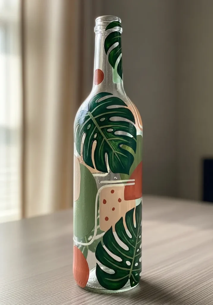 This slender, clear wine bottle serves as a stunning canvas for a lush botanical design mixed with modern geometric shapes. Oversized monstera leaves in deep forest green and vibrant emerald are painted with fine-line details to show off their iconic Swiss cheese patterns. These organic forms overlap soft abstract blocks of terracotta, sage green, and creamy beige, which creates a layered mid-century modern feel. Small white accents and delicate dotted patterns add an extra dimension of texture, while the long neck of the bottle features a single leaf climbing toward the top to tie the whole look together.