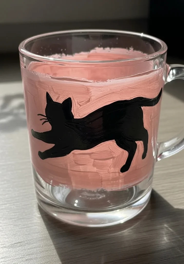 This clear glass mug features a charming handmade design that is perfect for any feline lover. A wide band of dusty rose paint creates a textured, painterly backdrop with visible brushstrokes that wrap around the center of the glass. Stretched across this pink canvas is a sleek black cat silhouette shown in a graceful, leaping pose. The matte black finish of the kitty contrasts beautifully with the glossy glass and the soft, opaque pink tones, while the clear base and rim keep the overall look modern and clean.