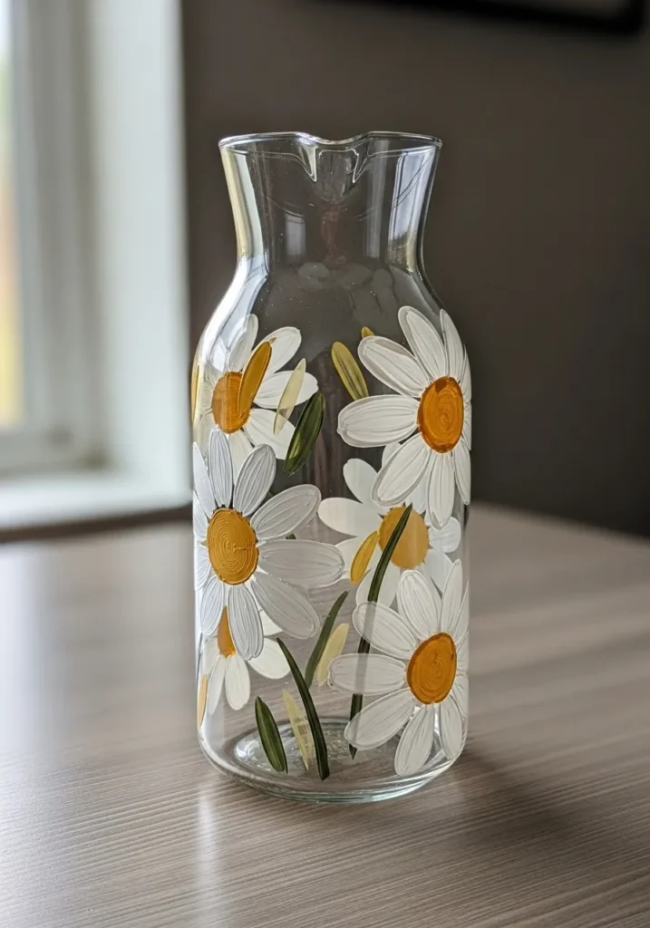 This elegant glass pitcher blooms with oversized daisies that wrap around its curved silhouette in a cheerful display. Each flower features crisp white petals painted with a thick texture that mimics the natural ridges of a real blossom. The centers are a warm honey mustard yellow, applied in swirling circles that catch the light beautifully against the transparent glass. Slender olive green stems and delicate leaf accents peek out from behind the petals, giving the entire design a fresh and airy feel that perfectly complements the clear, polished surface of the carafe.