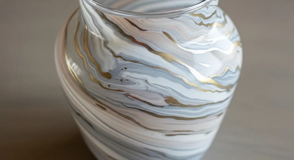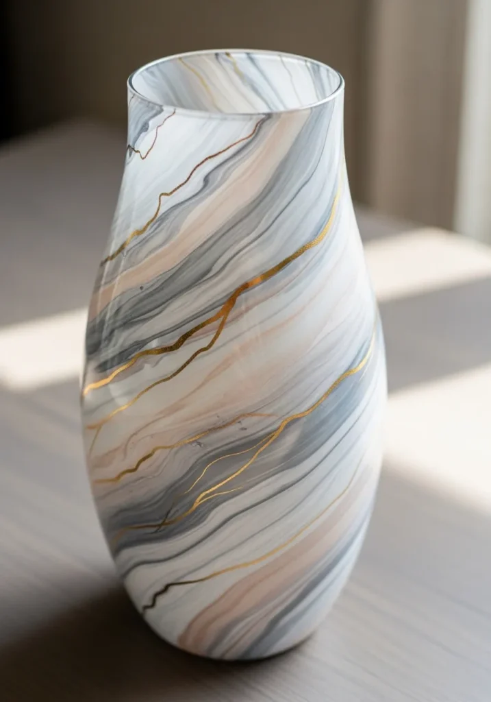 I am absolutely obsessed with this technique because it looks remarkably expensive but is actually such a fun experiment in color blending. You can achieve this gorgeous fluid look by pouring and swirling different shades of enamel paint inside or outside the glass, letting gravity do most of the hard work for you. It is the perfect project for those days when you want to get a little messy and creative without needing to be a master illustrator. Seeing those gold accents catch the light is honestly so satisfying, and I think this would be the ultimate “wow” piece to style on a minimalist entryway console.