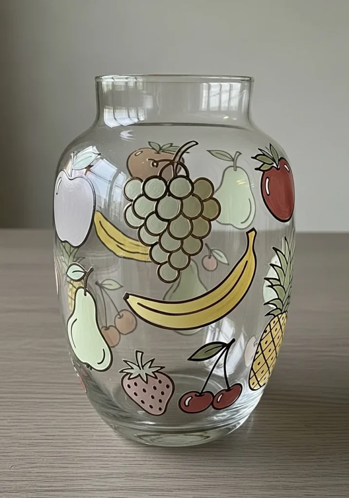 This adorable glass vase feels like a trip to a vintage farmer’s market with its charming collection of hand-painted fruits. The design features a colorful medley of bananas, grapes, pears, and strawberries, all rendered in a cute, illustrative style with bold black outlines. Each fruit is filled with smooth, opaque enamel paint in cheerful shades like sunny yellow, sage green, and cherry red. The clear glass background keeps the look light and airy, while the scattered arrangement of the produce gives the whole piece a whimsical, retro kitchen vibe that is just so inviting.