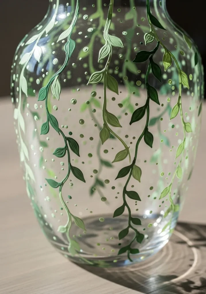I am absolutely head over heels for this design because it brings such a peaceful, organic energy to any room without the need for a green thumb. It is a total joy to paint those curving vines because you can just let your hand follow a natural, flowing path down the side of the vase. No matter your skill level, you can achieve this high-end look by simply layering different leaf shapes and adding those sweet little dots for extra sparkle. It feels like such a sophisticated way to dress up a plain glass find, and I think it would look stunning holding a few simple white tulips on a bedside table.