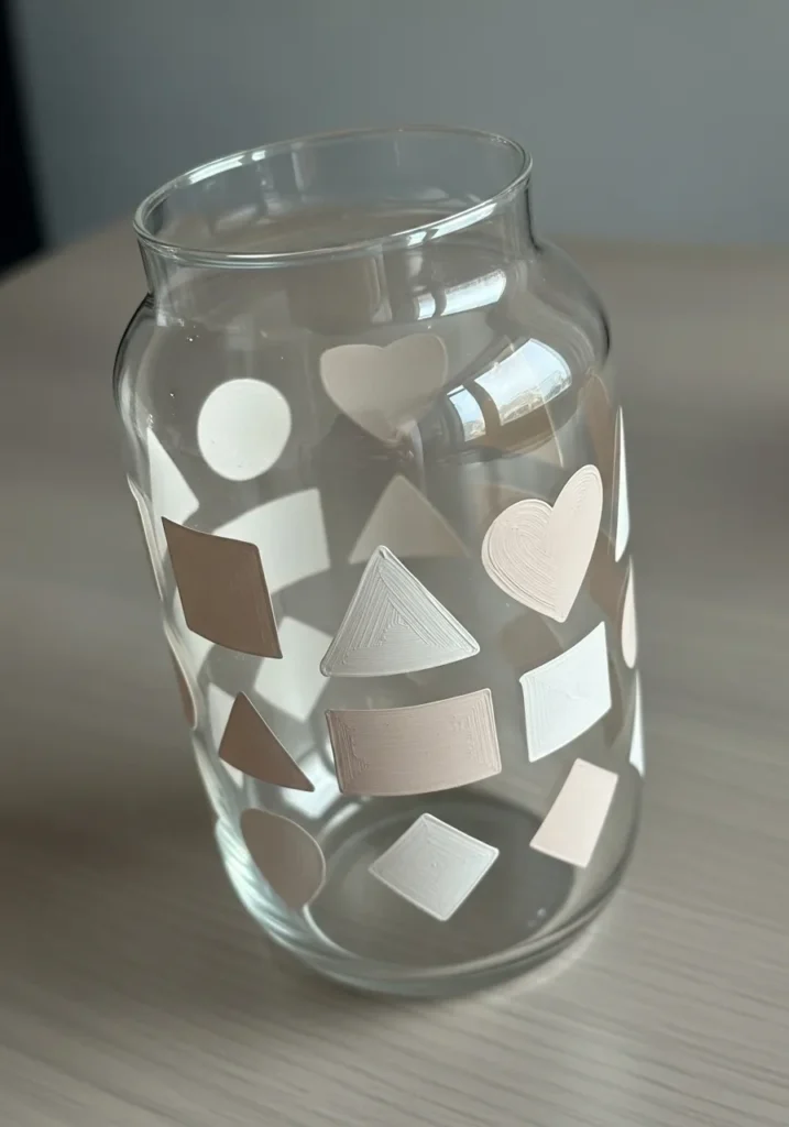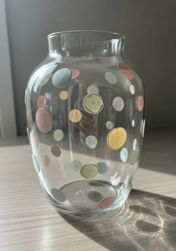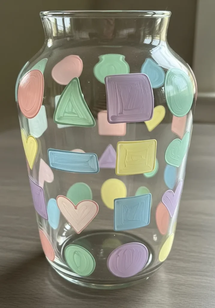 This cheerful glass vase is covered in a playful scattering of hand-painted geometric shapes that look just like colorful confetti. The design features a sweet mix of hearts, triangles, squares, and circles in a soft palette of mint, lavender, peach, and lemon yellow. Each shape is filled with a thick, opaque paint that shows off whimsical swirling brushstroke textures, giving the piece a lovely raised feel against the clear glass. The arrangement is totally random and breezy, making the whole vessel feel lighthearted and modern while the smooth glass keeps everything looking polished.