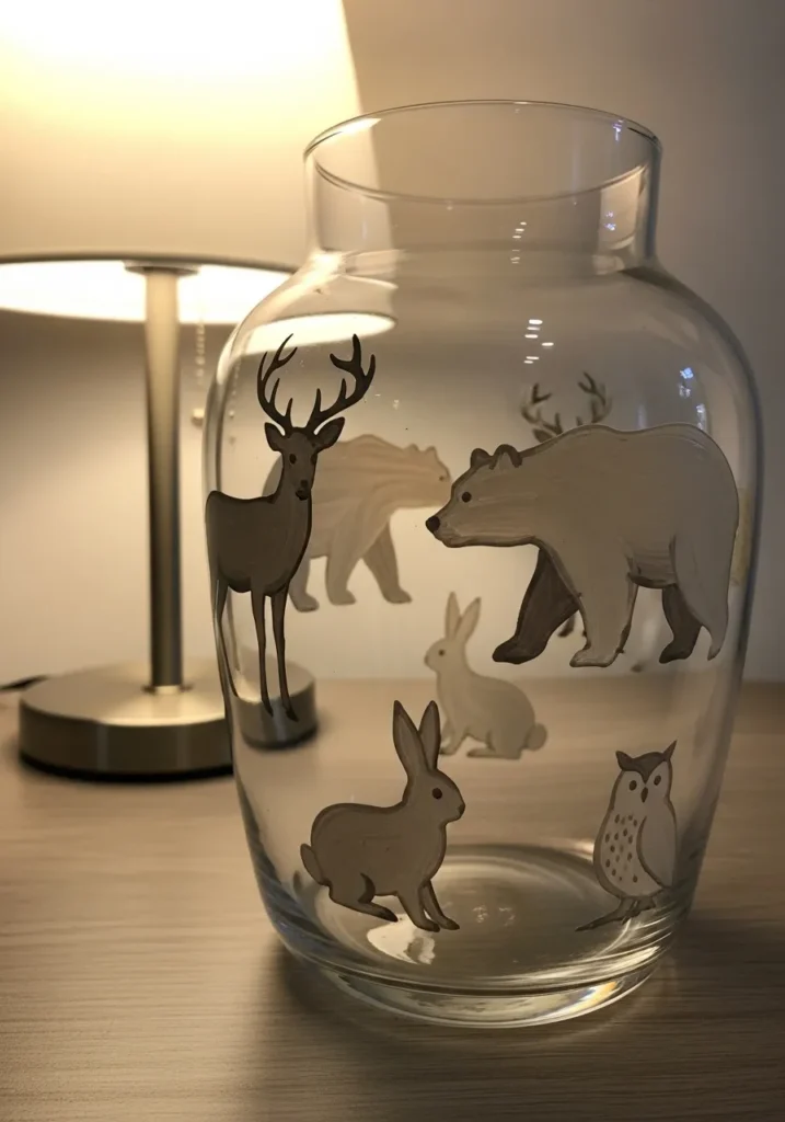This whimsical glass vase brings a touch of storybook magic into your home with its charming hand-painted forest animals. The design features a tall, noble deer with impressive antlers, a sturdy brown bear, a sweet little rabbit, and a tiny watchful owl scattered across the clear glass surface. Each creature is rendered in soft, earthy tones like taupe, cream, and charcoal, using smooth enamel paints that stand out beautifully against the transparent background. The minimalist, illustrative style gives the piece a modern yet cozy feel, while the glossy glass provides a sleek finish that highlights every fine detail of the fur and feathers.