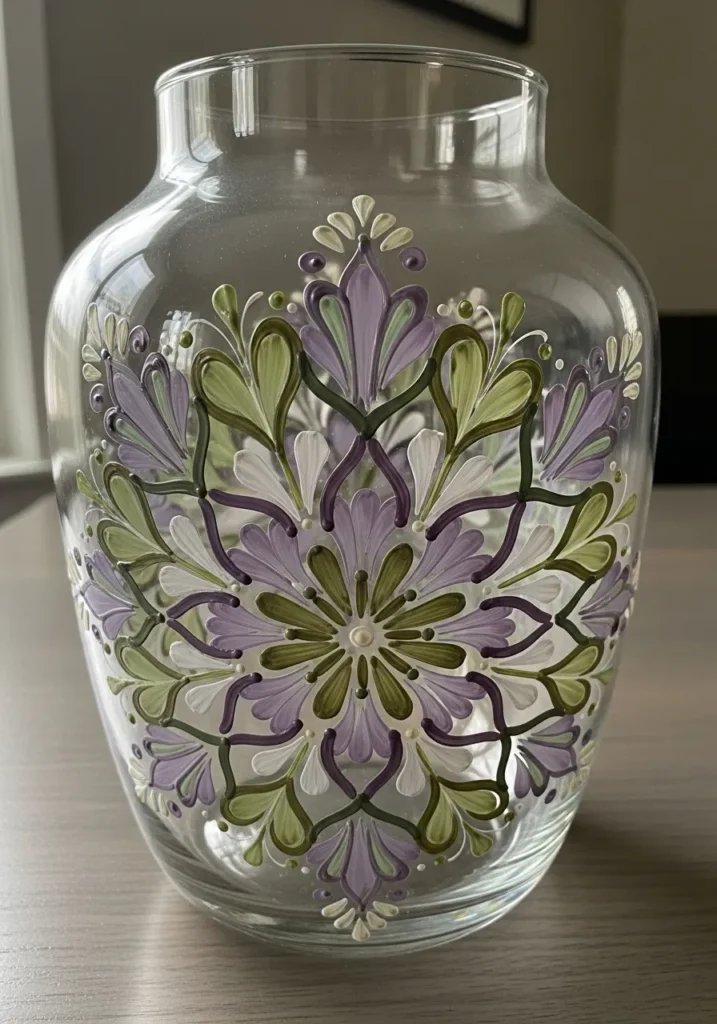 This breathtaking glass vase features a perfectly symmetrical mandala design that blooms from the center in a gorgeous array of botanical patterns. The artist used a sophisticated palette of deep plum, soft lavender, and sage green, accented with crisp white highlights that make the whole design pop. Every petal and leaf-like shape is meticulously outlined with thin, dark lines, creating a beautiful stained glass effect against the clear vessel. The smooth, glossy finish of the paint adds a lovely tactile quality to the glass, turning a simple vase into a stunning centerpiece that feels both meditative and high-end.