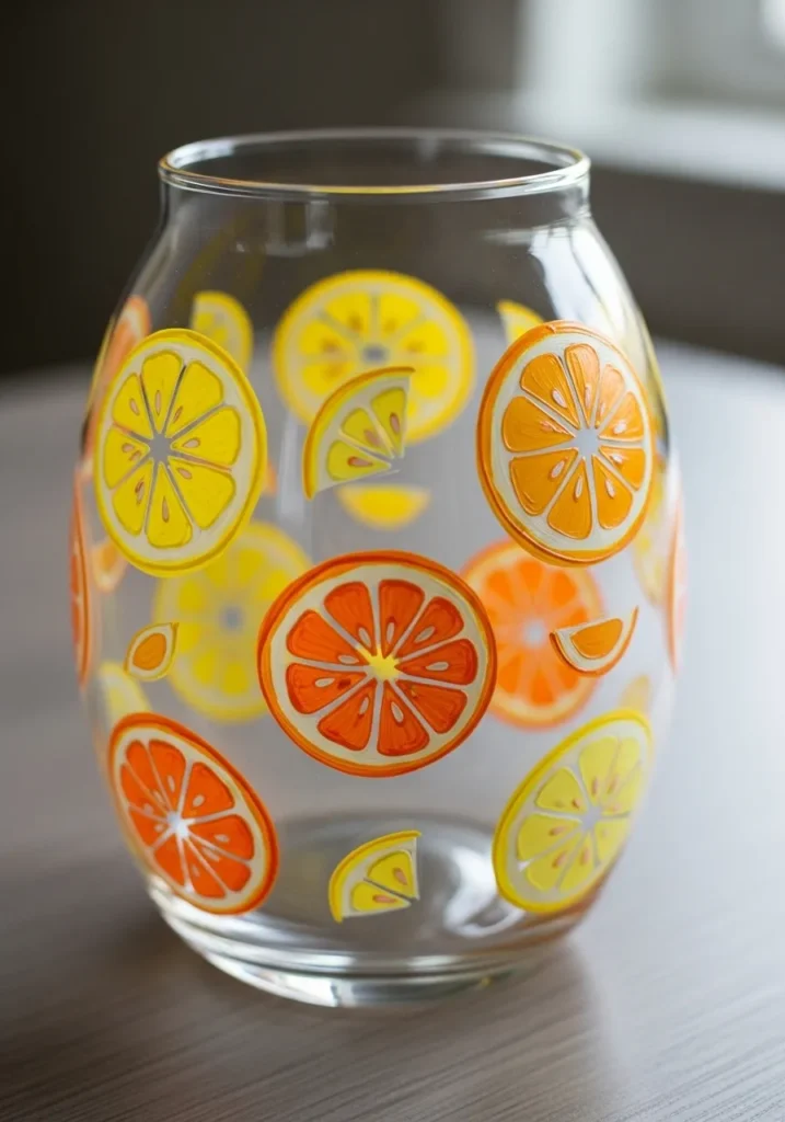 This playful piece brings a burst of sunshine into any room with its vibrant lemon and orange slices. The design features bold circles of bright yellow and deep tangerine painted directly onto a clear, rounded glass jar. Each fruit segment is detailed with thick white outlines and tiny juice droplets to give it a realistic yet whimsical pop art feel. The smooth glass provides a clean background that makes those saturated citrus colors look incredibly juicy and fresh. It is the perfect size for holding kitchen utensils or acting as a cheerful vase for a bunch of daisies on a sunny windowsill.