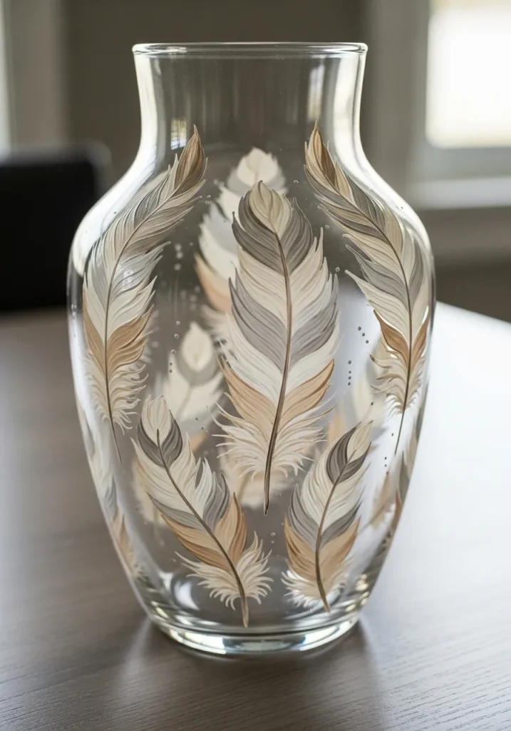 This stunning glass vase features a collection of large, hand-painted feathers that gracefully “float” around the vessel. The design uses a sophisticated, neutral palette of warm taupe, slate gray, creamy white, and soft tan. Each feather is incredibly detailed, with fine, sweeping brushstrokes that create a realistic, wispy texture for the individual barbs. To add a bit of whimsy, tiny clusters of dots are scattered between the feathers, looking like little beads or air bubbles caught in the light. The clear glass background ensures the intricate linework remains the star of the show, resulting in a piece that feels both organic and high-end.