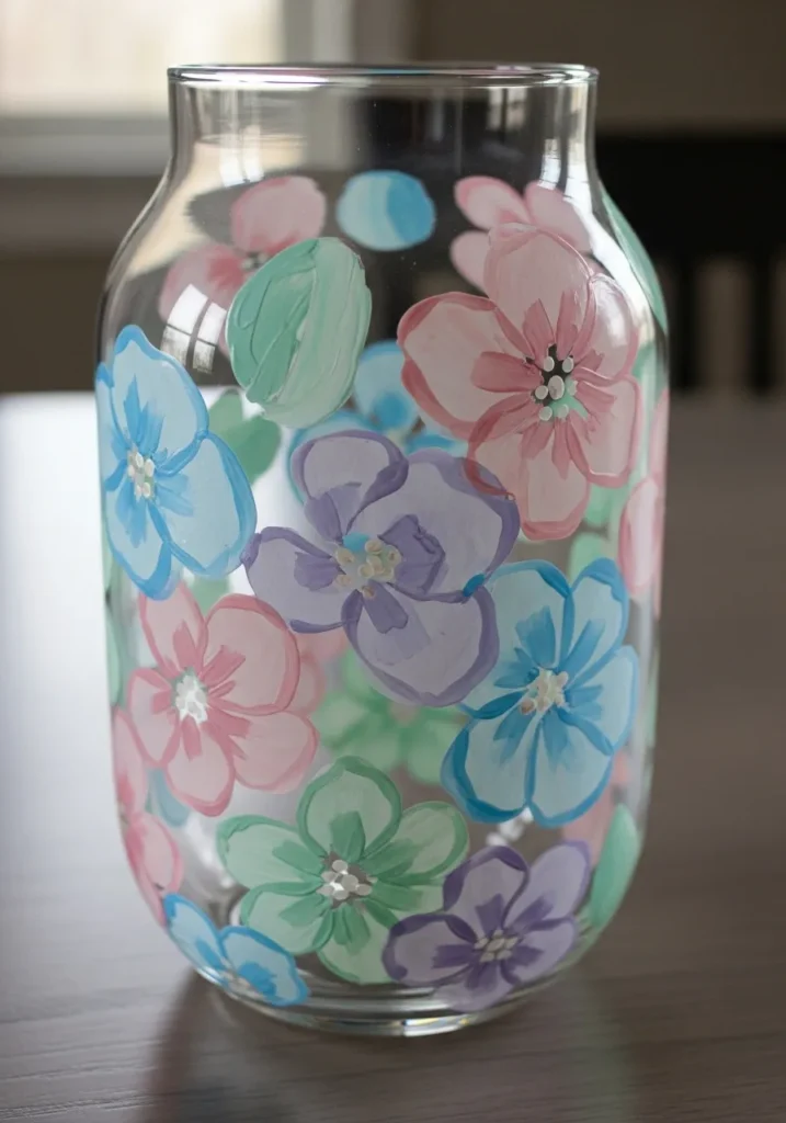 This charming glass jar is a celebration of spring with its vibrant, hand-painted floral patterns. The design features large, whimsical flowers in a dreamy palette of cornflower blue, dusty rose, lavender, and mint green. Each petal is rendered with thick, intentional brushstrokes that give the blossoms a beautiful painterly texture, while the centers are finished with delicate white dots for a touch of detail. The flowers overlap playfully across the clear glass surface, creating a lush, garden-like effect that feels both cheerful and sophisticated.