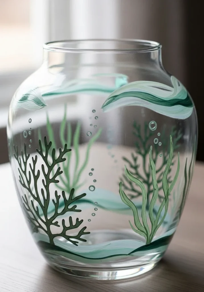 I think this is such a clever project because it uses a very limited color palette to create a really sophisticated, calming aesthetic. If you’ve enjoyed the botanical or ocean wave designs we looked at earlier, this is like the perfect mashup of the two. It’s incredibly forgiving for beginners—corals and seagrass are naturally irregular, so there’s no such thing as a “mistake” here. I love how the clear glass makes it feel like a mini aquarium on your shelf, especially if you place it where the light can catch those little painted bubbles.