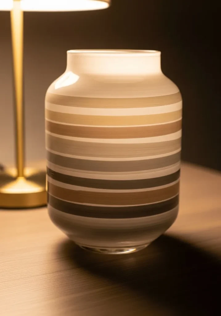 This stylish glass jar features a series of clean horizontal stripes in a sophisticated palette of sand, taupe, and slate gray. The design uses opaque matte paints that transform the transparent glass into a solid contemporary piece with a smooth satin texture. Each band varies slightly in thickness, which gives it a high-end artisanal look, while the cream-colored top provides a bright, neutral finish. It looks like something you would find in an expensive boutique but carries that wonderful weight of a solid glass vessel.