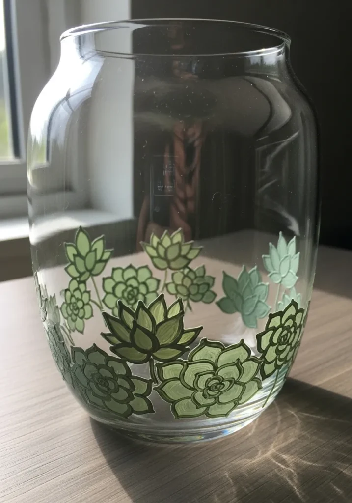 This darling glass container features an adorable ring of hand-painted succulents that wrap around the base in various shades of sage and mint green. The artist used a clever layering technique with opaque glass paints to create those iconic fleshy leaves and dark green outlines that give each little plant a charming, illustrated look. The top half of the jar remains clear, which creates a beautiful sense of balance and lets you see the intricate details of the desert flora from every angle. It has a wonderfully smooth finish and a whimsical vibe that would look right at home on a boho-inspired bookshelf or a bright office desk.