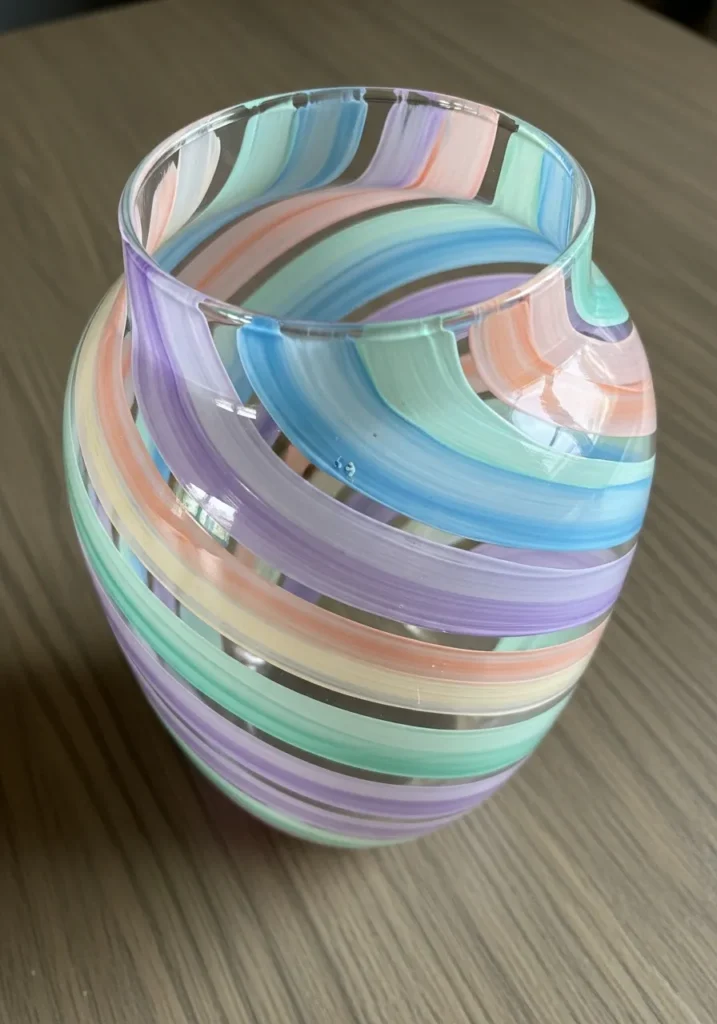 This dreamy glass vase is a total showstopper with its thick, sweeping brushstrokes of candy-colored paint that wrap around the curved surface. The design features a cheerful mix of lilac, mint green, sky blue, and soft peach tones that overlap to create a beautiful sense of movement and depth. Using translucent glass as a canvas allows the light to filter through the vibrant stripes, highlighting the lovely ridges and textures left by the paintbrush. It has a glossy, glass-like finish that makes the colors pop, turning a simple round vessel into a piece of modern, playful home decor that feels light and airy.