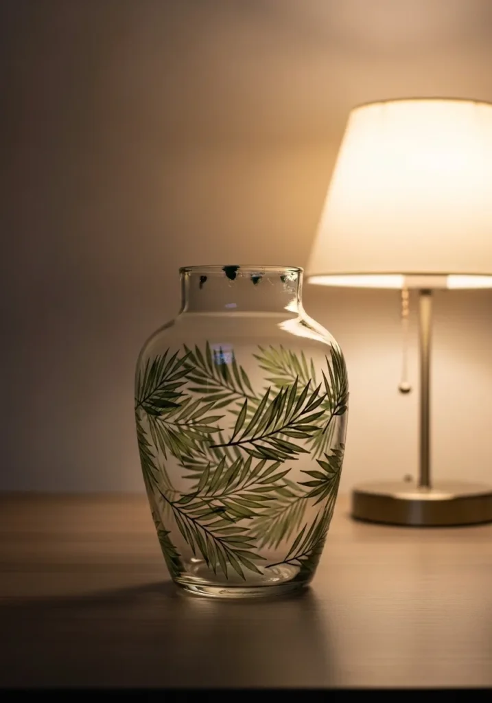 This sophisticated glass vase features a stunning display of hand-painted fern fronds that dance across the clear surface in varying shades of forest and olive green. The design utilizes a delicate layering technique where some leaves appear translucent and light while others are bold and dark to create a realistic sense of depth and movement. Each tiny leaflet is meticulously detailed with thin black veins that pop against the smooth glass. The overall look is incredibly polished and high-end, with the natural botanical theme providing a refreshing organic touch to the sleek vessel.