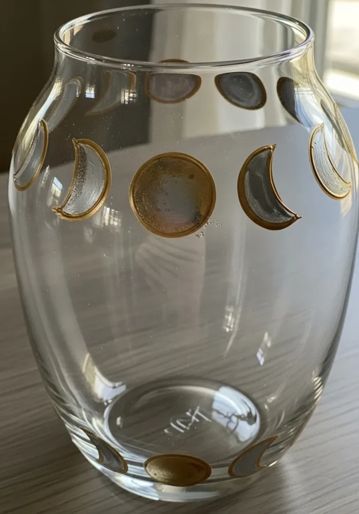 This mystical glass vase features a stunning row of hand-painted moon phases that wrap elegantly around its curved center. Each lunar stage is depicted with a shimmering silver interior that has a wonderful dappled texture, almost like the actual surface of the moon. To give it that extra touch of luxury, every crescent and full circle is meticulously outlined with a raised metallic gold border. The clear glass backdrop keeps the design feeling airy and sophisticated, making it a perfect piece for anyone who loves a bit of celestial magic in their home decor.