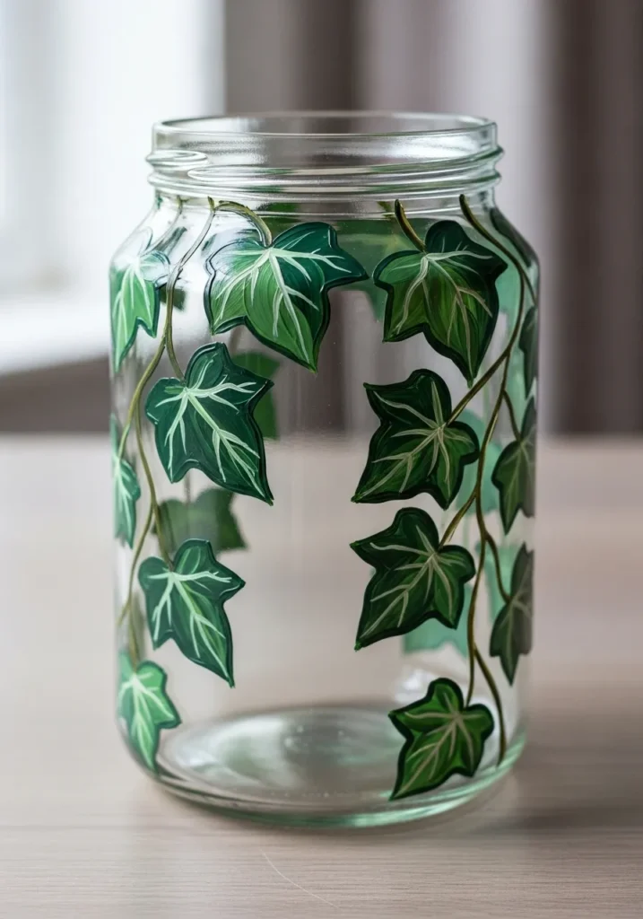 I love simple plant designs because they feel elegant without being fussy. Ivy leaves are easy to repeat which makes the painting process calm and relaxing. A jar like this blends beautifully into almost any room and works well for holding flowers, candles, or everyday bits and pieces.