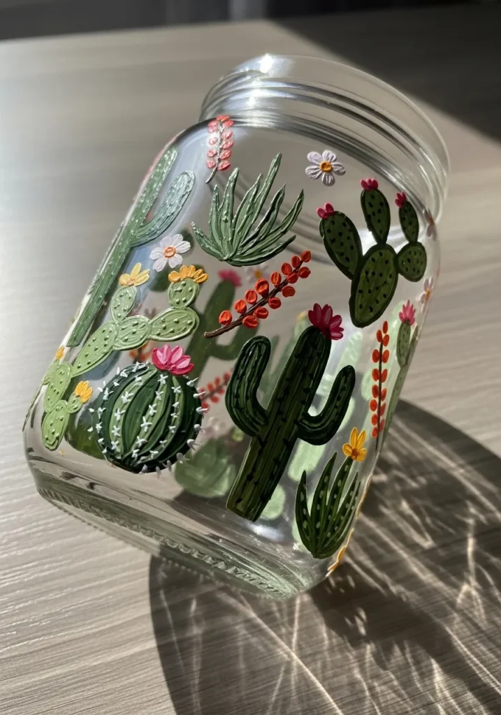 I love how cactus designs look detailed without being difficult to paint. Each plant has its own shape which makes the process creative but still relaxed. A jar like this adds a cheerful pop of green to a shelf and it is a fun project for anyone who enjoys plant inspired crafts.