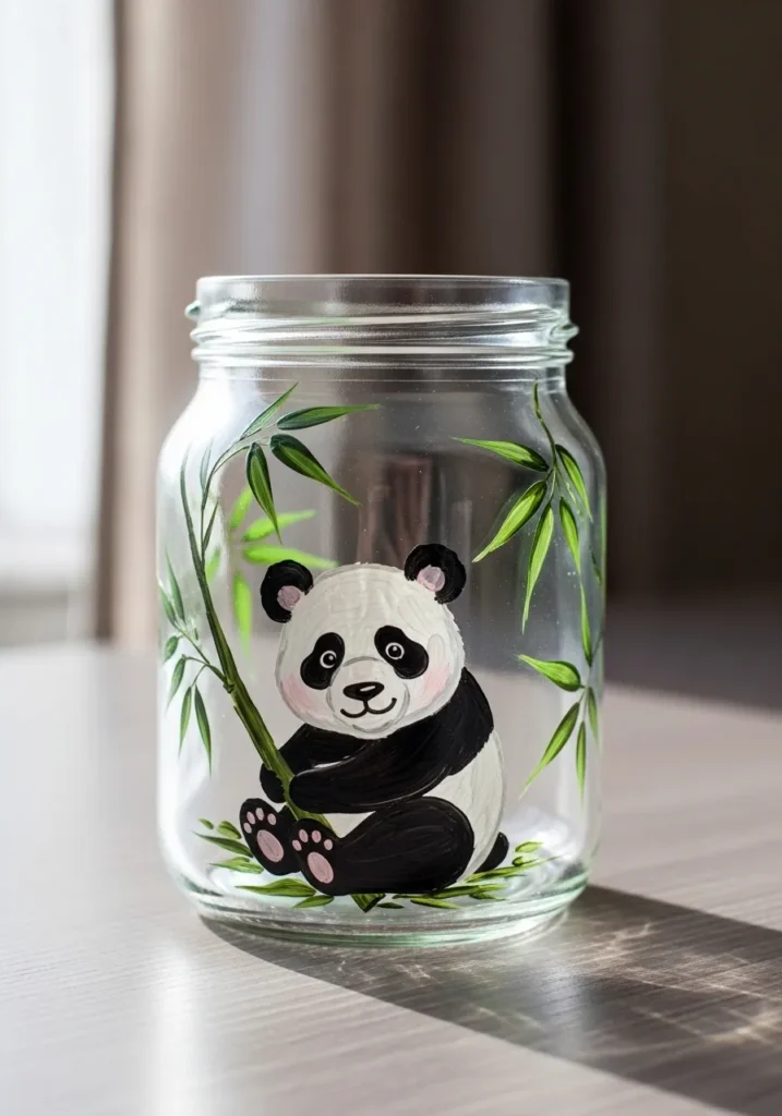 This clear glass jar features a sweet little panda sitting among tall bamboo leaves. The panda is painted in classic black and white with soft rounded shapes that make the character feel gentle and friendly. Around it are light green bamboo stalks and leaves that frame the panda and give the design a calm nature inspired look.