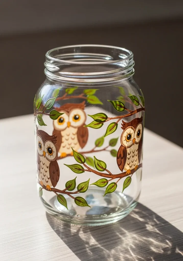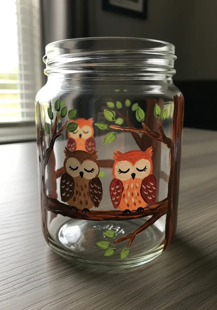 I have always loved owl themed crafts because they instantly feel cute and cozy. Painting a few simple owl shapes on a branch is surprisingly easy once the basic circles are sketched in. I think this jar would look adorable on a bookshelf or desk and it makes a fun project for anyone who enjoys playful animal designs.