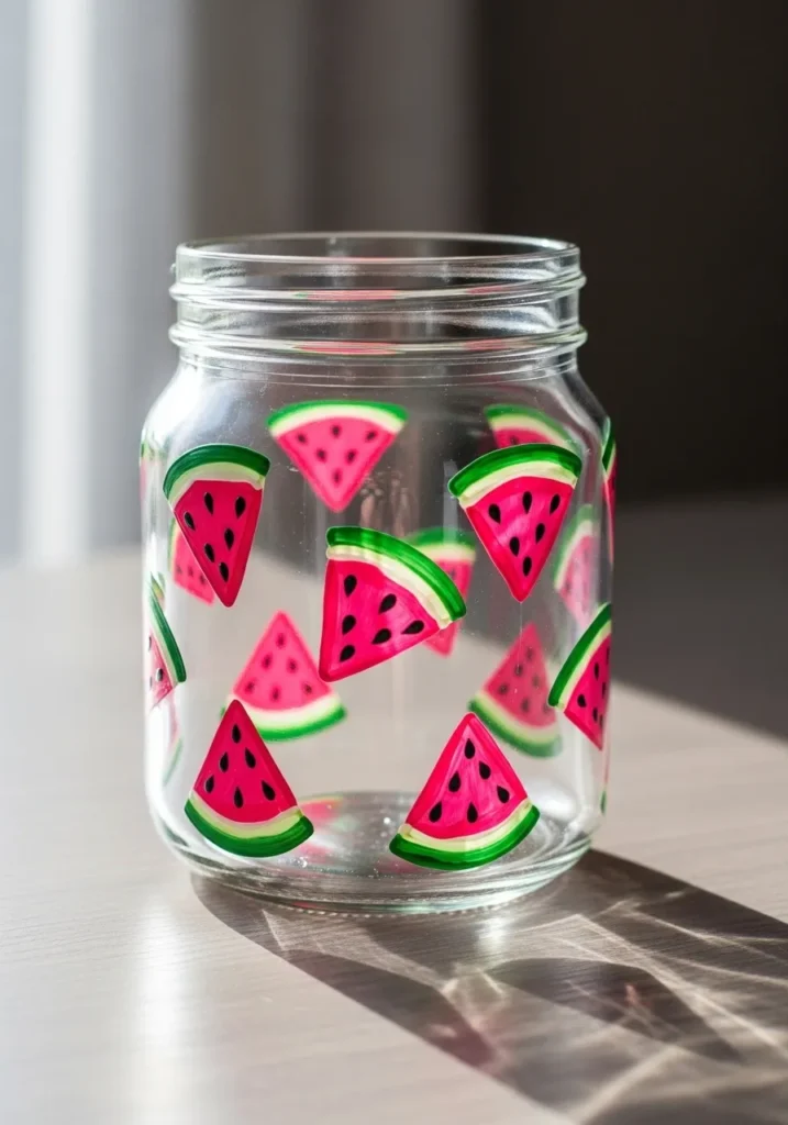 This bright painted jar is covered with cheerful watermelon slices arranged around the glass. The slices show vivid red fruit with tiny black seeds and fresh green rinds. The bold colors pop against the clear jar which gives the whole design a lively summer feeling.