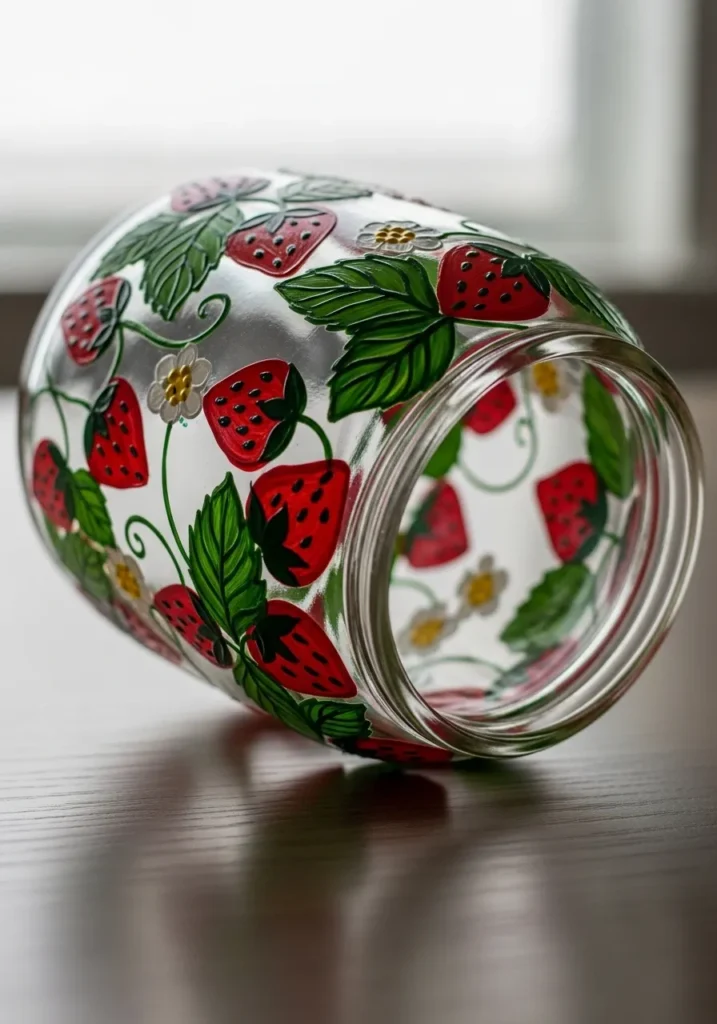 This kind of design always makes me smile because it feels fresh and summery. Painting strawberries is surprisingly simple since the shapes are soft and forgiving. I think it is a fun project for anyone who loves cute kitchen decor or colorful handmade storage jars. A jar like this looks adorable holding candy, craft supplies, or even fresh flowers.