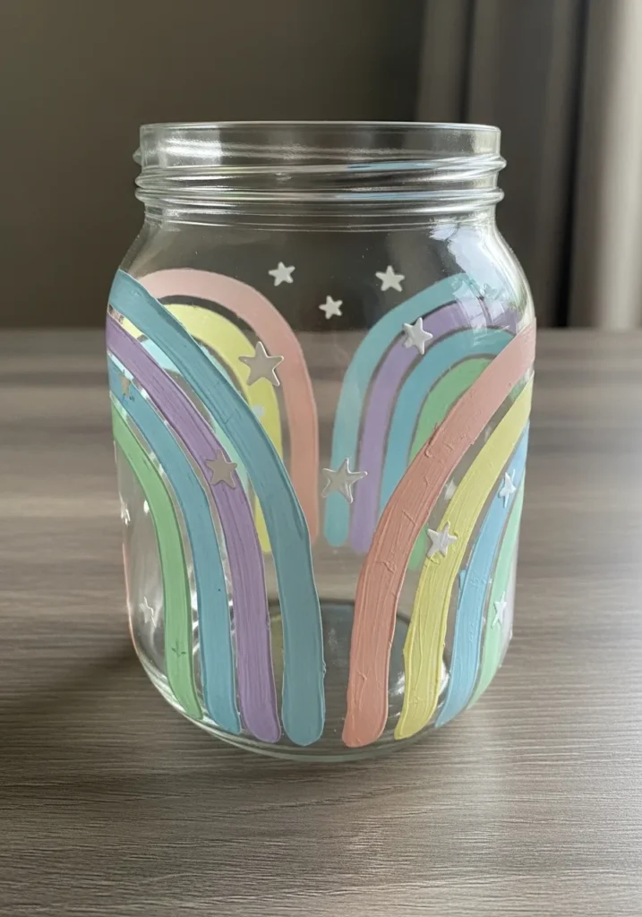 This cheerful glass jar features a set of flowing rainbow arches painted in gentle pastel shades. Soft colors like mint green, blush pink, pale yellow, and lavender curve upward across the jar while tiny white stars sparkle above the rainbow. The smooth acrylic lines create a playful design that feels both modern and whimsical against the clear glass.