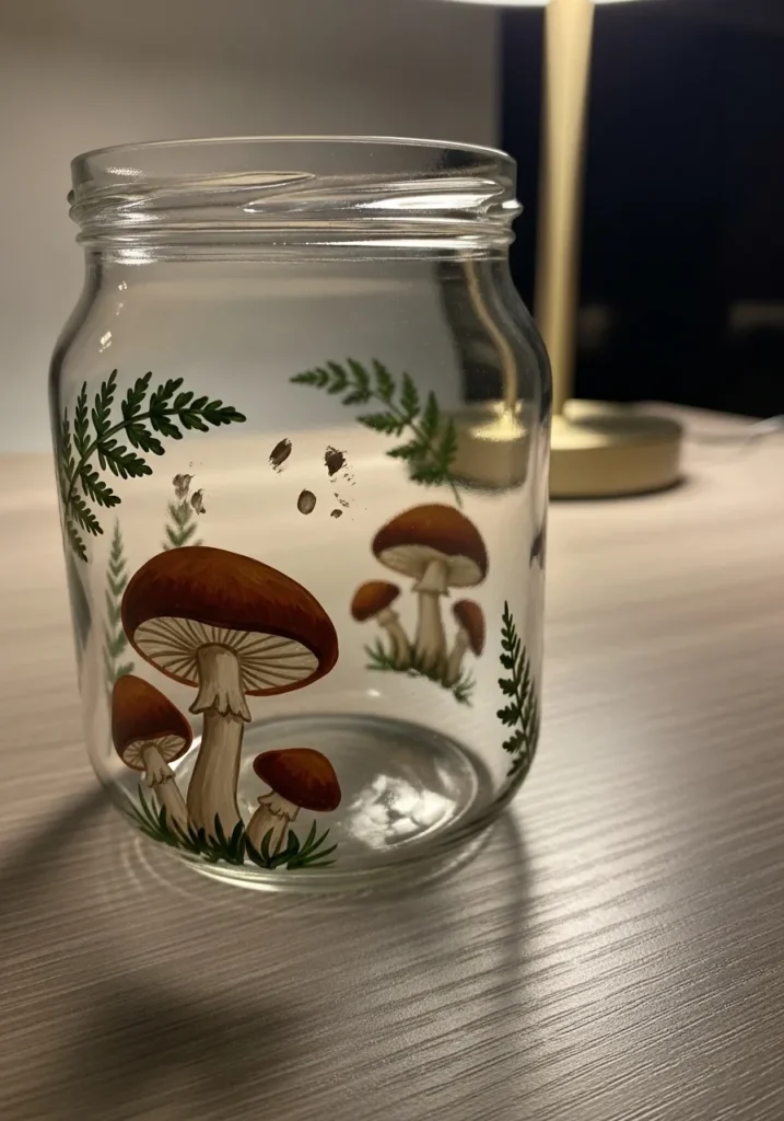 This jar shows a small woodland scene with hand painted mushrooms growing among delicate forest plants. The mushrooms have warm brown caps with creamy stems and are surrounded by tiny leaves and grasses. Soft earthy colors give the design a gentle nature inspired look that wraps naturally around the glass.