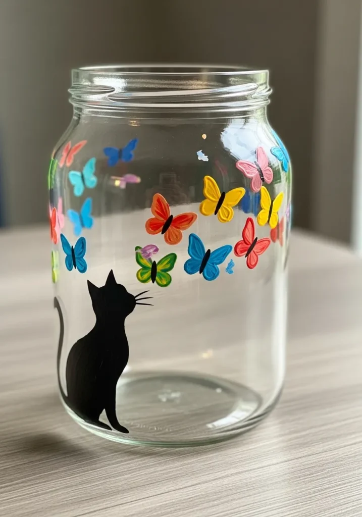 I love how much personality this jar has with such a simple idea. The cat silhouette is very easy to paint and the butterflies are perfect for adding bursts of color. This is one of those projects that feels quick but still looks eye catching once it is finished.