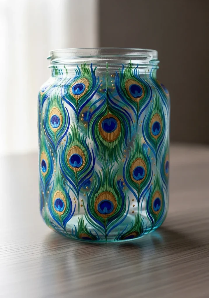 Peacock feathers are such a fun design to paint because the colors blend together so nicely. I like how each feather can be slightly different which keeps the craft creative and relaxed. This jar feels bold and decorative and it makes a beautiful accent piece on a shelf.