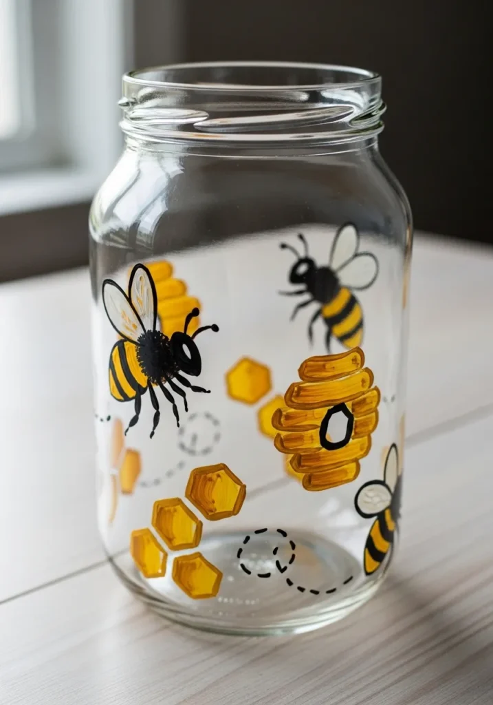 This cheerful jar is decorated with buzzing honeybees flying among golden honeycomb shapes. The bees are painted in bright yellow and black with tiny wings while the honeycomb cells are filled with warm golden tones. Small dotted flight trails weave between the shapes which adds a playful movement to the design.