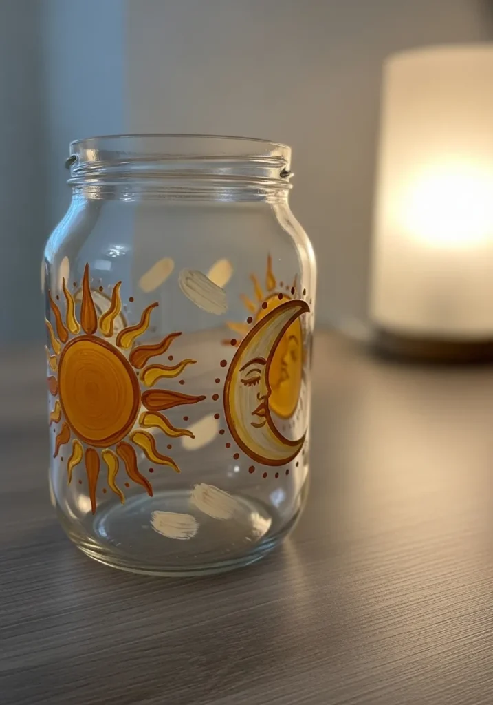 I think sun themed jars are such a cheerful craft to try. The shapes are simple which makes them beginner friendly but the result still looks eye catching. When light hits the glass the golden paint almost glows which makes the jar feel extra special. I would happily use this one as a little candle holder or shelf accent.