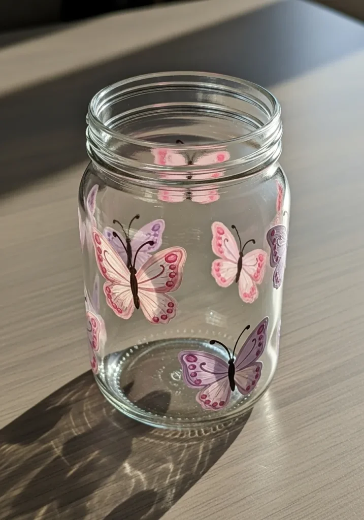 I think butterfly jars feel wonderfully feminine and calming. Painting butterfly wings can be surprisingly fun because each one can look a little different. It is the kind of project where perfection is not required which makes the whole process relaxing. I love the idea of placing this jar on a vanity or craft shelf for a pretty handmade touch.