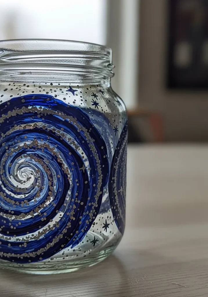 This jar features a swirling galaxy painted across the glass using rich shades of navy blue, bright cobalt, and hints of white stars. The spiral design wraps around the jar like a tiny universe captured in glass. Small speckles of white paint mimic distant stars while the deep blue tones create beautiful contrast against the clear jar.