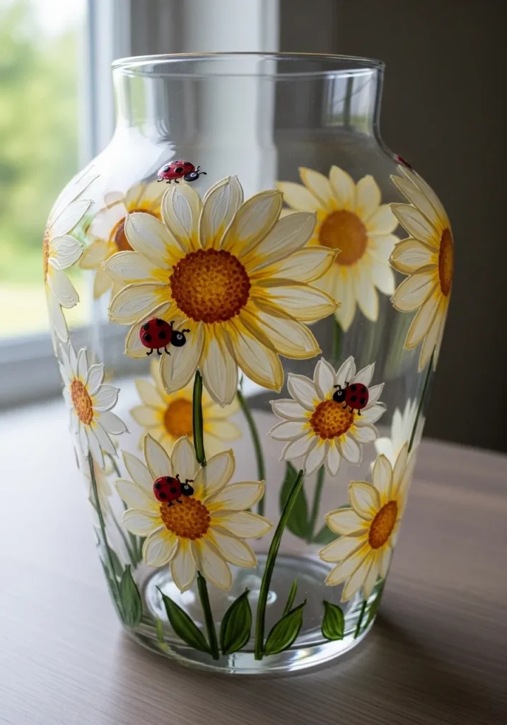 This charming glass vase features a whimsical garden scene brought to life with thick acrylic paints. The design showcases bright white and buttery yellow sunflowers with textured brown centers that pop right off the smooth glass surface. Tiny red ladybugs with black spots crawl playfully across the petals and green stems, adding a sweet touch of nature. The brushwork is visible and deliberate, giving the whole piece a lovely handcrafted feel that catches the light beautifully through the clear glass.