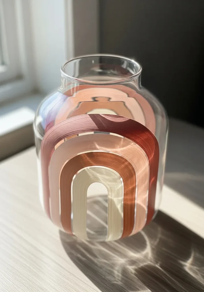 This modern glass vessel features a large, stylized rainbow painted in a sophisticated palette of warm clay and muted earth tones. The design uses broad arched bands of terracotta red, dusty rose, and a soft cream that wrap around the middle of the clear glass. Each stripe shows off beautiful horizontal brush textures, which give the smooth surface a more rustic and handcrafted feel. The clean lines of the rainbow provide a wonderful geometric contrast to the rounded shape of the vase, while the transparent gaps between the arches keep the whole look feeling light and airy.